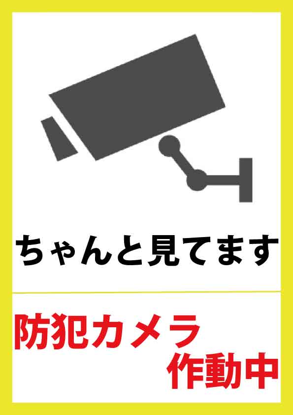 カメラのシルエットを大きく配置し、直感的に意味が伝わる構成にした ・「防犯カメラ作動中」を赤文字で強調し、重要情報を明確にした ・上部のメッセージ「ちゃんと見てます」で心理的抑止効果を意識 ・文字サイズに強弱をつけ、情報の優先順位を整理 ・装飾を抑え、遠目でも読み取りやすいシンプルなレイアウトにした